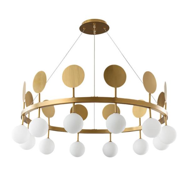 The main materials of this artistic glass pendant light are stainless steel and glass. The color of the lamp body is titanium gold and milk white. There are two shapes of circle and rectangle. The size of circle is D650*350 and D950*350, and the size of rectangle is 1200*100*350 and 1500*100*350. The light source is a G9 bulb, which is not included in the factory. This pendant light can be customized in size and color according to customer needs.