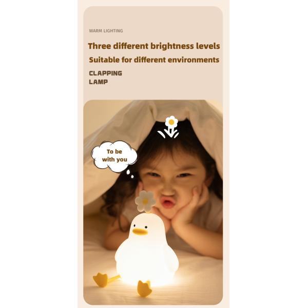 Features: 1.The kids night light is made of high-quality silicone shell, which is soft and squishable -- perfect for little hands to hold. Durable and won't easily break if you fall. It is 100% safe for children. 2. Bright and soft LED beads, energy-saving and environmentally friendly. Warm light with 3 brightness adjustable, eyes-friendly. Silicone Night Lights are great for night lighting, rest, etc. 3. Creative baby night lights. With a gentle touch, you can easily adjust the brightness or turn on and off the duck night lights. 4. USB charging light (built-in 1200mAh), which can be powered by the power bank or connected to any adapter for use. 5. Cute flower duck night light is a gift that kids look forward to, the warm light gives them a sense of security at night, and is also a beautiful decoration for their bedroom.