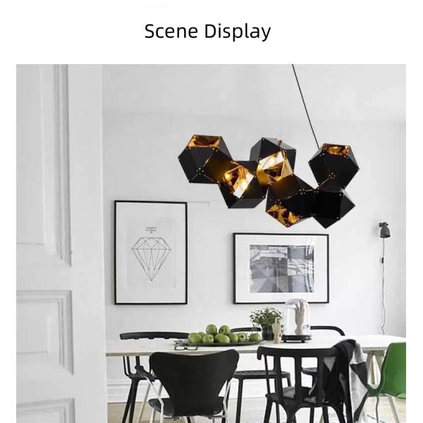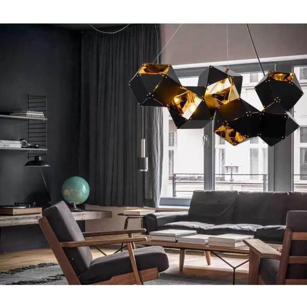 This chandelier has several functional advantages. Its geometric, modular design not only adds a unique and modern aesthetic to spaces but also allows for flexible arrangement. The contrast between the dark outer shells and the reflective gold interiors enhances light diffusion, creating a warm and ambient glow.